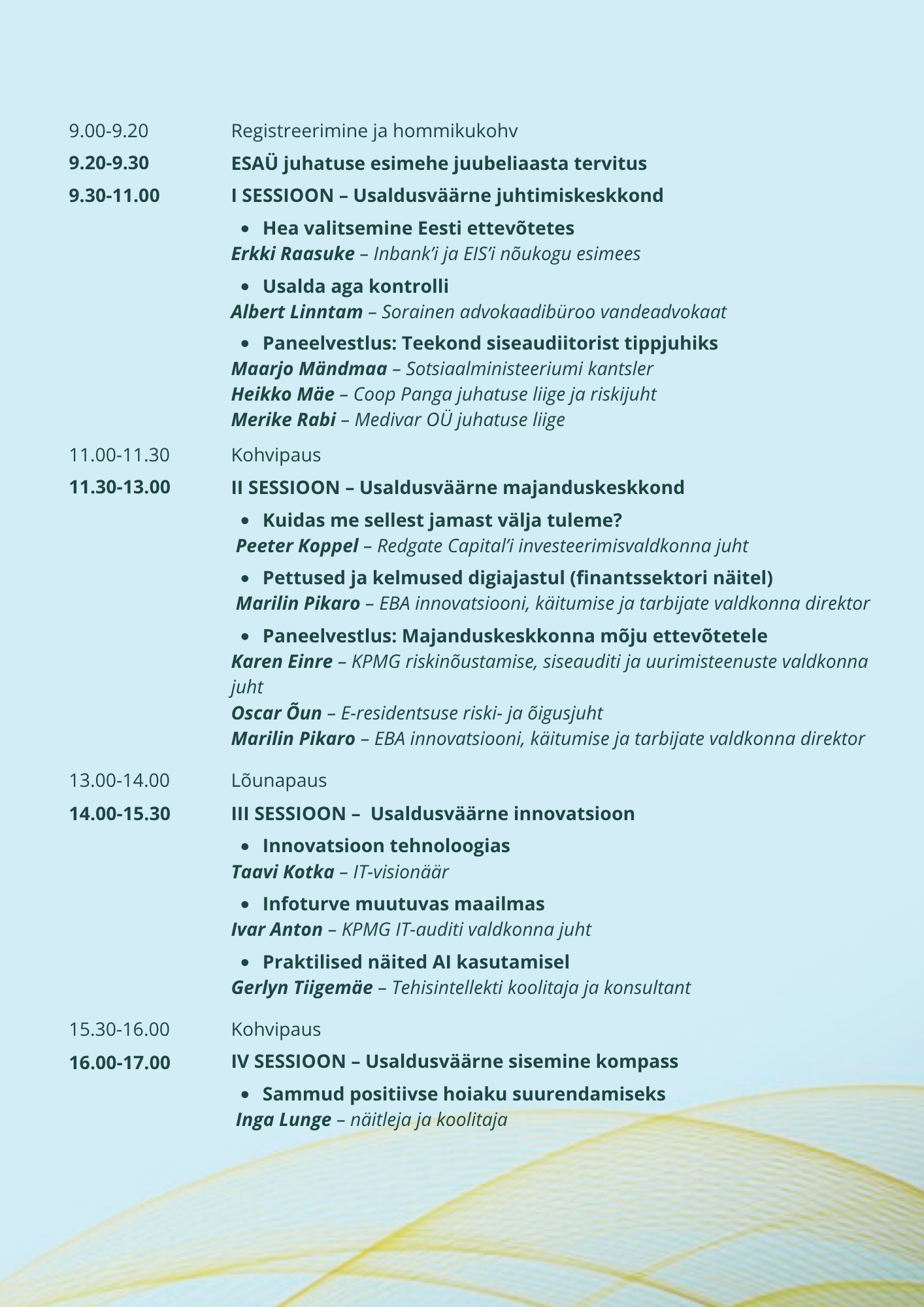 Konverentsi moderaator on Karin Rätsep, kes on Eesti Siseaudiitorite Ühingu liige ja Bigbank siseauditijuht.