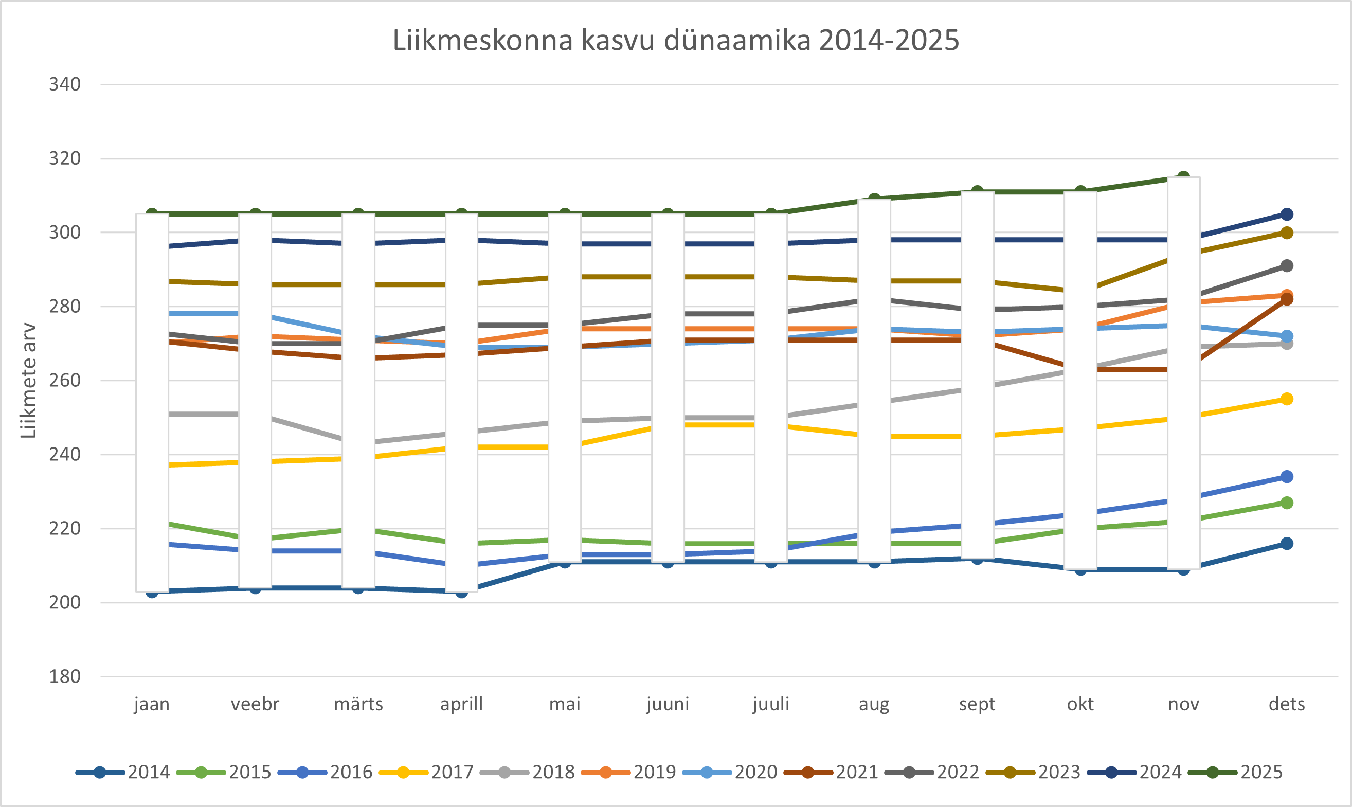 Ühingus on 2025.a novembri lõpu seisuga 315 liiget (vt graafikut), nendest 10 on ajutiselt liikmestaatuse peatanud. 40% liikmetest on ühingusse kuulunud 10 ja enam aastat. Ühingu liikmeskond on kasvanud 54% perioodil 2014-2025 (kasv 204-lt 315 liikmeni).