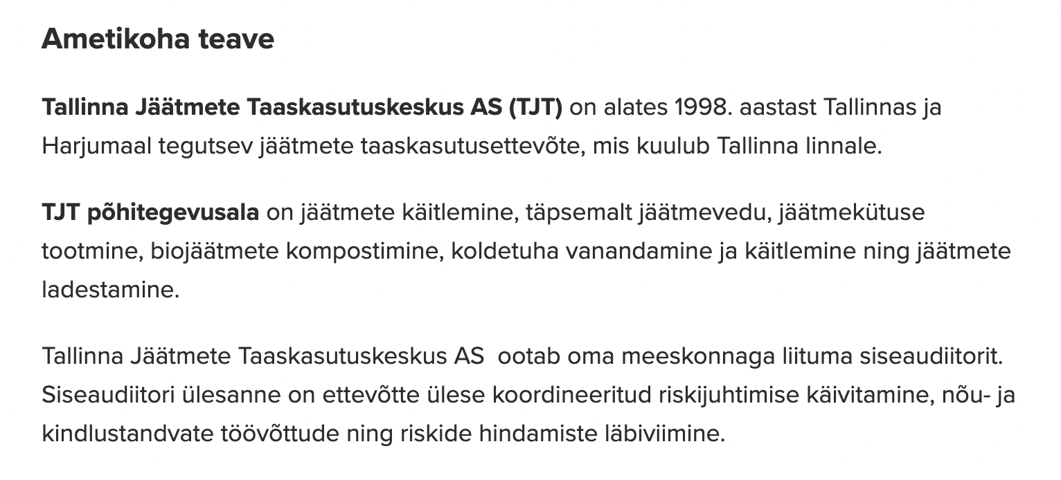 Tallinna Jäätmete Taaskasutuskeskus - Siseaudiitor